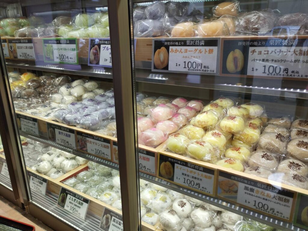 種類も豊富で、定番の豆大福から変わり種まで、色とりどりの大福が並ぶショーケースは見ているだけでワクワクします。1個100円〜という手頃な価格帯(店舗により異なる場合があります)で提供されることが多いのも、このチェーンの強みです。